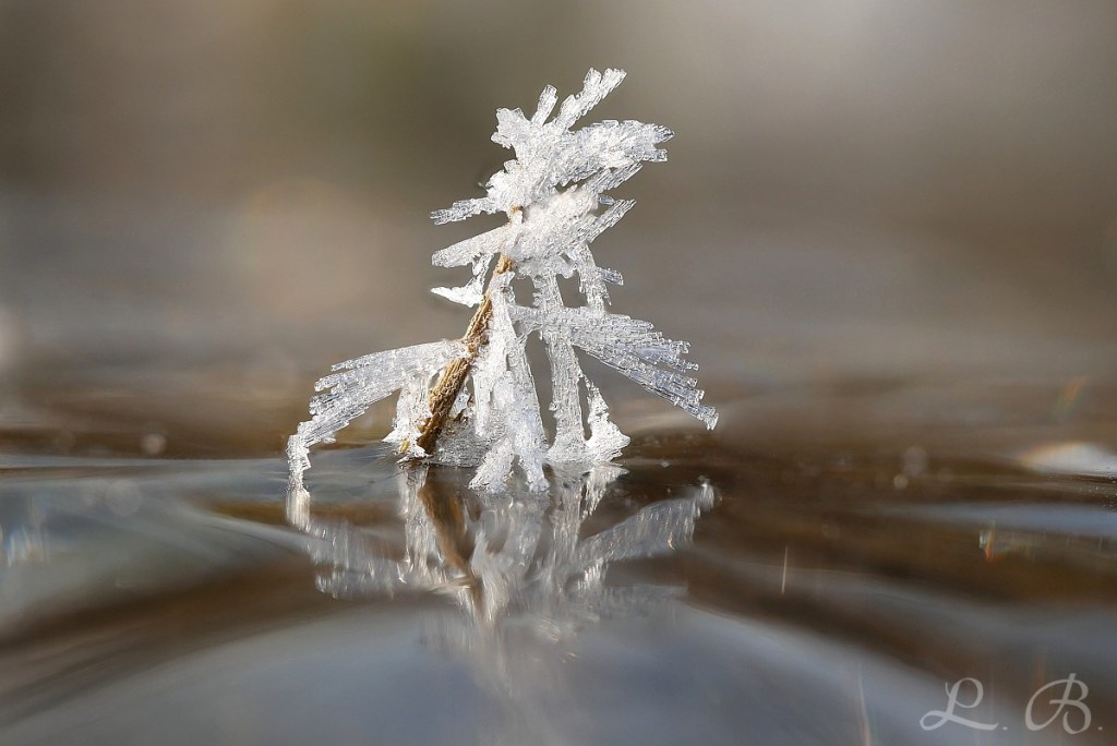 Der Frost zauberte auf einer gefrorenen Pfütze einen glitzernden Eis-Wald. Zum Bewundern, zum Eintreten in den funkelnden Mini-Wald musste man sich aber fast auf den Bauch legen und zum Fotografieren die Nah-Linse aufschrauben. Aber ich glaube, es hat sich gelohnt.